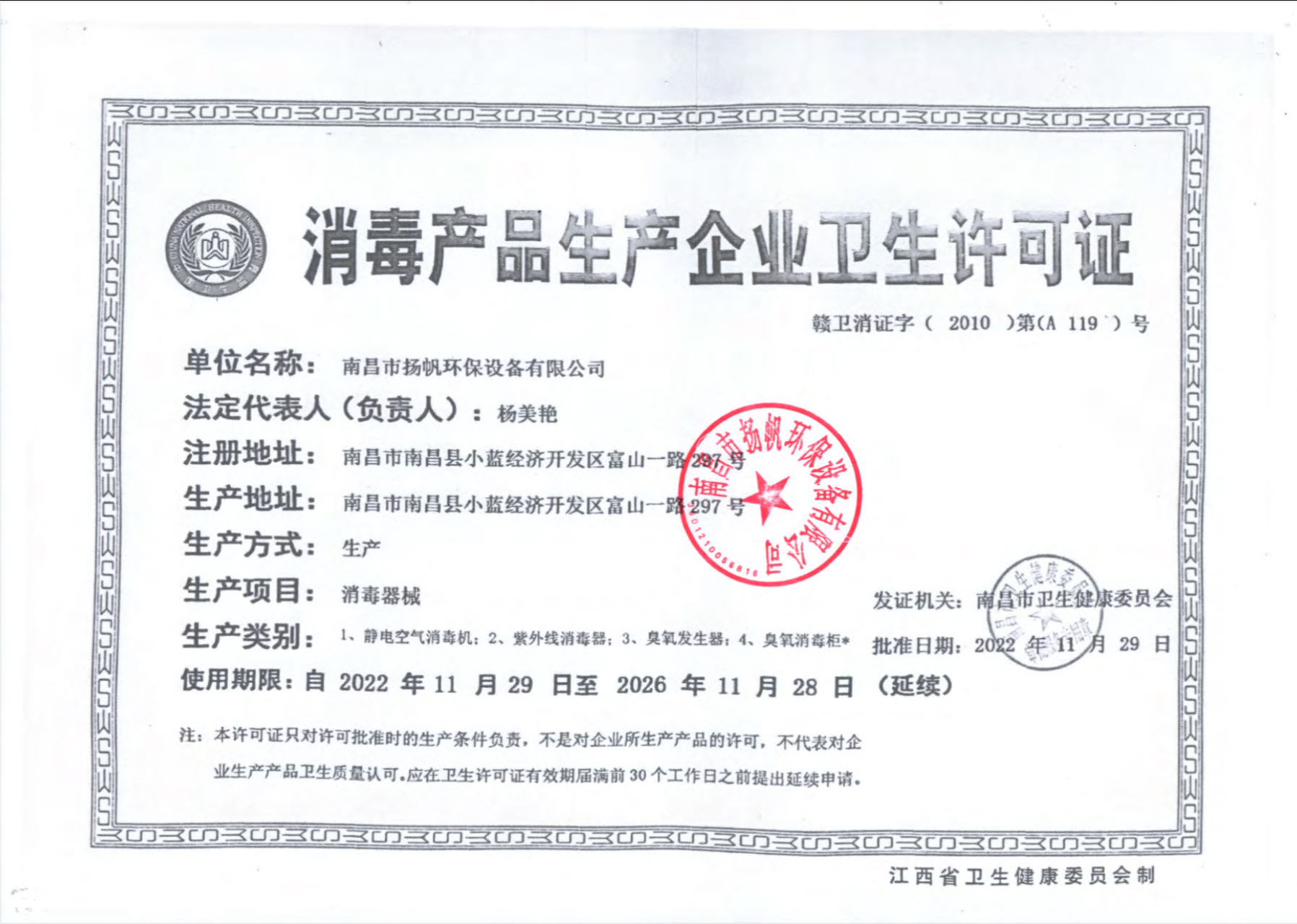 消毒產品企業衛生許可證